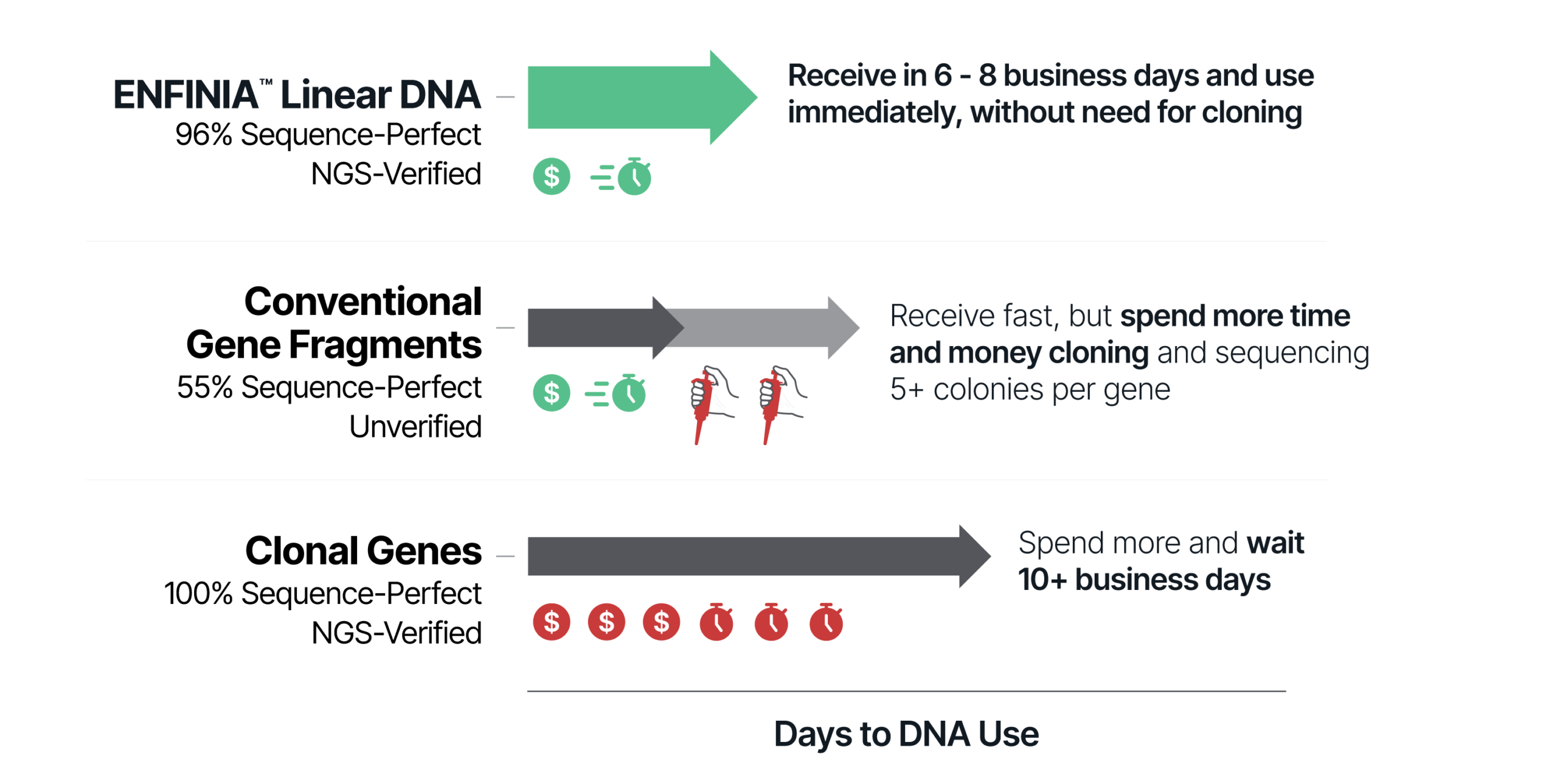 ENFINIA Linear DNA combines the speed and affordability of fragments with the accuracy of clonal DNA.