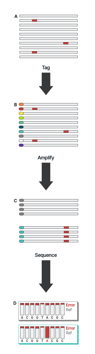 A population of identical DNA molecules may contain rare errors introduced during synthesis.