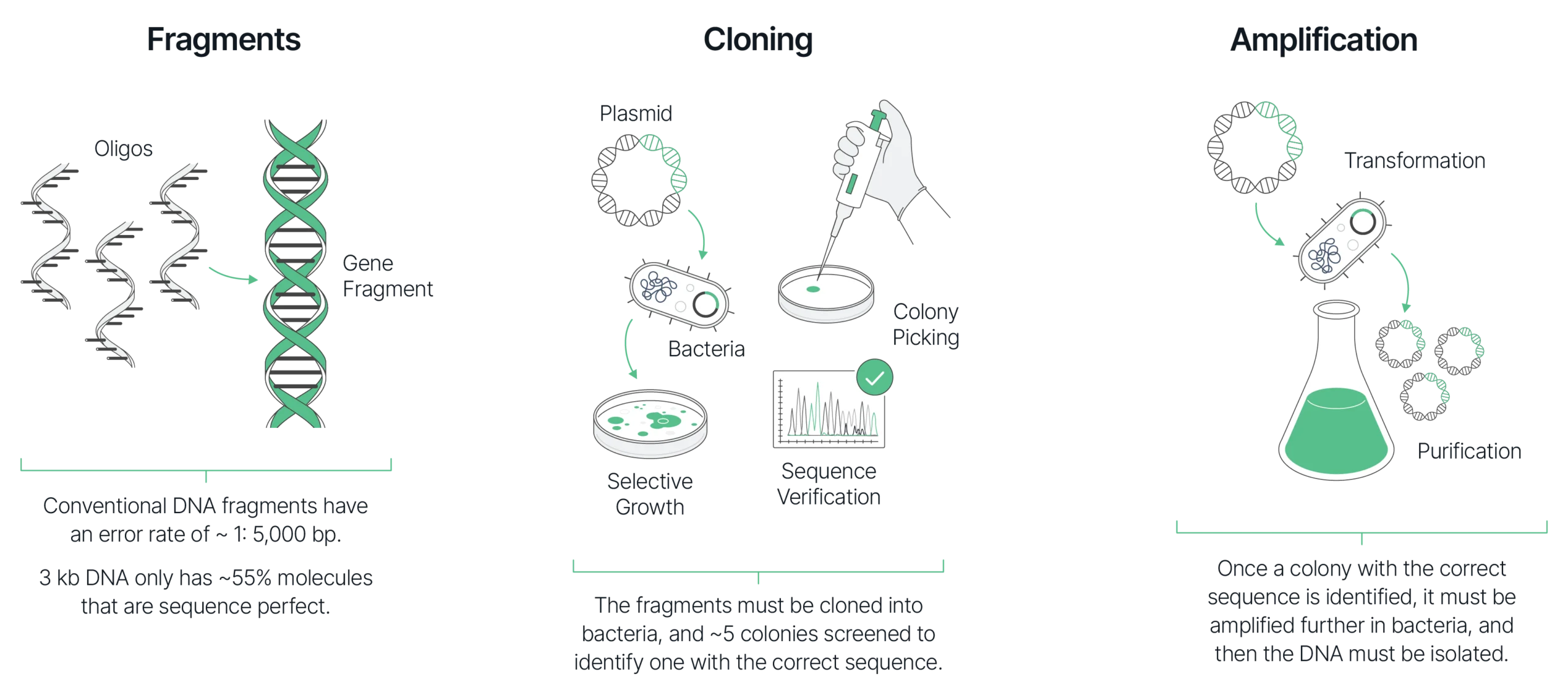 While conventional DNA fragments are inexpensive and fast to produce, most non-clonal gene fragments on the market are produced with a 1:5000 error rate or higher. For a 3 kb gene, only about half of its molecules would actually be sequence-perfect.